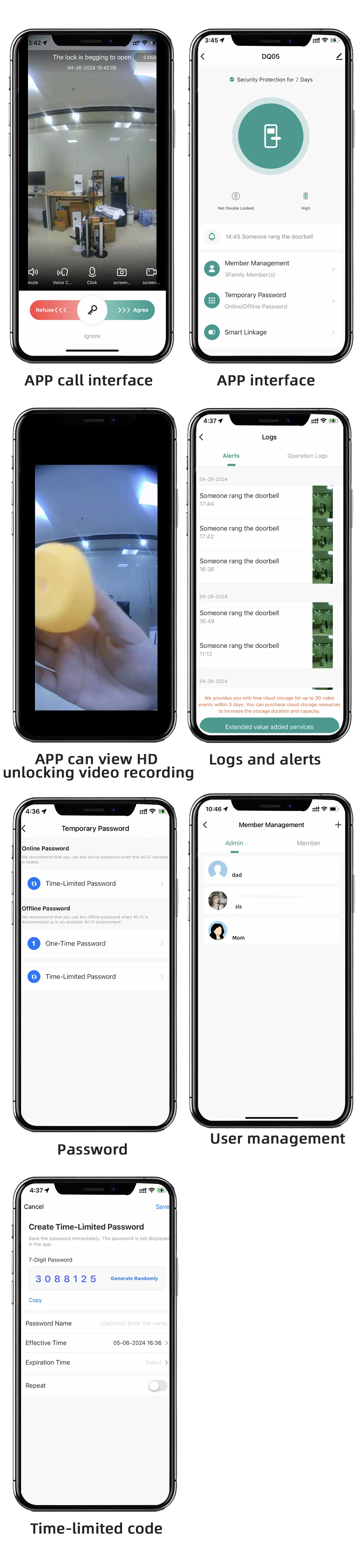 Real-time access to door lock status, remote one-touch unlocking, visitor logs, alarm logs, door lock power, and remote authorization with a temporary password.