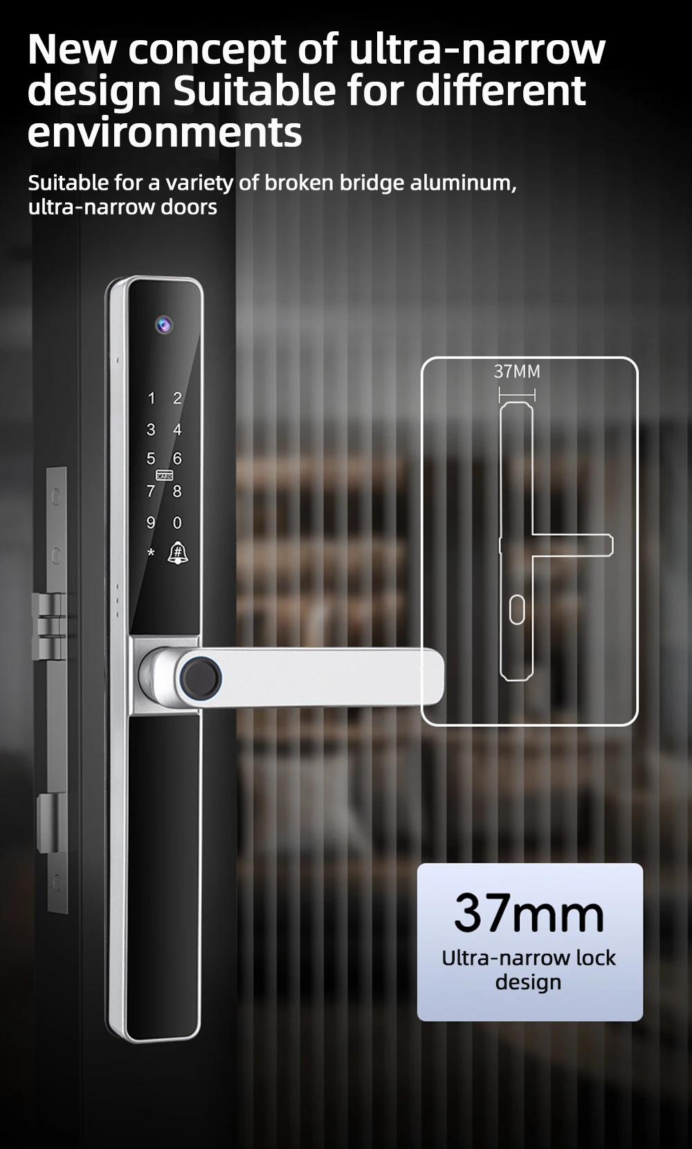 DQ05 is an IP66 waterproof Tuya wifi smart door lock with built-in camera and built-in peephole. DQ05 supports video calls on Tuya APP. 3.1mm narrow design is suitable for more than 99% of doors, such as aluminum doors, bridge-cut alum doors, framed glass doors, wooden doors, sliding doors, swing doors, etc., suitable for door thickness of 28-80mm