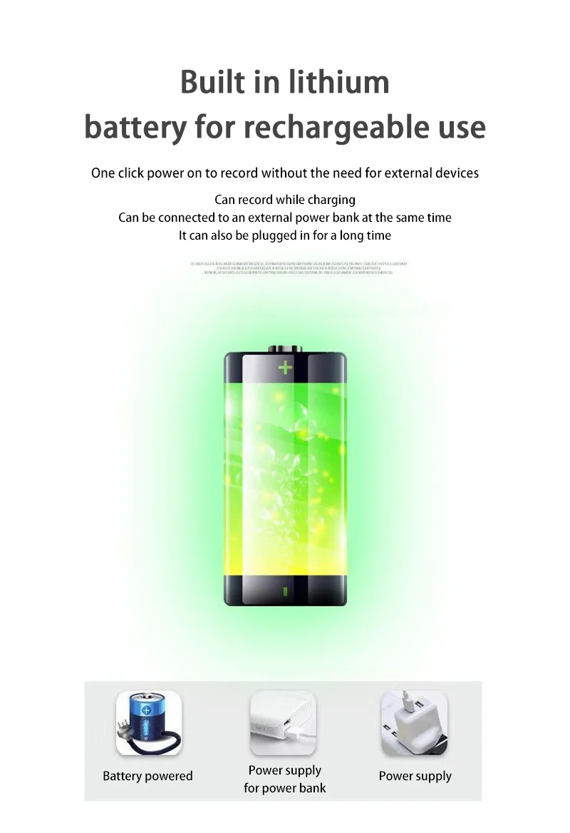 2. No need to plug in, built-in lithium battery, can be recharged and used repeatedly. One-click startup can record, no external equipment is required, and can be charged and recorded at the same time. It can be connected to an external power bank at the same time, or it can be plugged in for a long time.